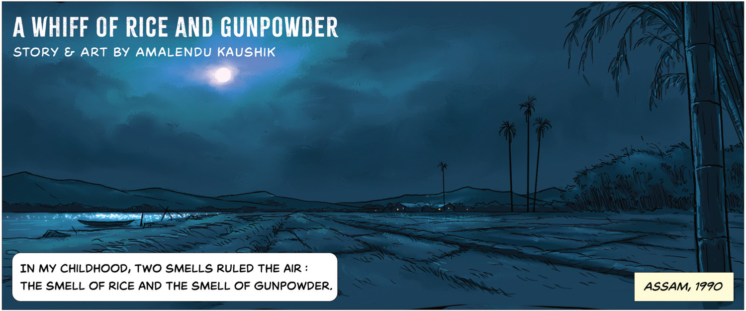 At its core, ‘A Smell of Rice and Gunpowder’ is an attempt to tell the story of Assam through memory, smell, and emotion rather than slogans or headlines. For a generation that grew up after the peak of insurgency, much of this history has been skipped or forgotten, yet its traces remain in silence, fear, identity, and everyday life. Through this comic, I wanted to bring forward stories of Assam, historically and culturally, not to glorify violence but to view them with empathy. To understand that behind every conflict lie ordinary lives, ordinary kitchens, and ordinary people trying to survive extraordinary times.