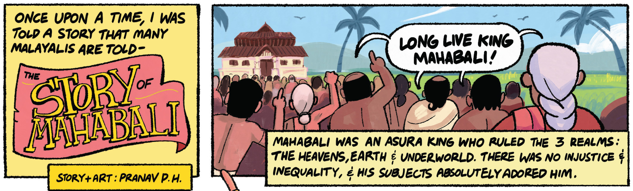 The comic explores the multiple identities of Mahabali, the great Asura King whom Malayalis all over the world revere and welcome during the festival of Onam. Currently, a single image of Mahabali dominates storefronts, banners and media all over Kerala during Onam – a jolly, fair-skinned, pot-bellied, janayu-sporting King, clad in heavy jewellery. Was this always the image of Mahabali that occupied the most space in public consciousness?